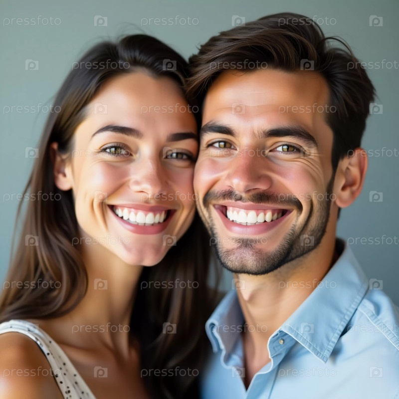 Молодая пара стоит рядом, излучая счастье, когда они ярко улыбаются друг другу.Их нежная связь сияет в этот интимный и веселый момент в помещении Generative AI