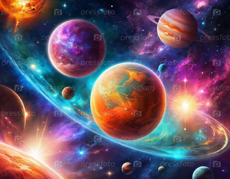 Планетарная система с несколькими планетами, большой ярко окрашенный газовый гигант и скалистая планета. Яркие звезды и обширное пространство темного пространства с галактикой на заднем плане. Космические пространства. Космонавтика. ИИ