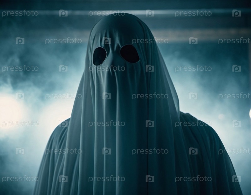Призрачная фигура в белом листе стоит в тумане. Фигурное лицо затенено листом, но два темных глаза можно увидеть, вглядываясь в ткань. Фон, наполненный закрученным туманом и тенями. Хэллоуин. ИИ