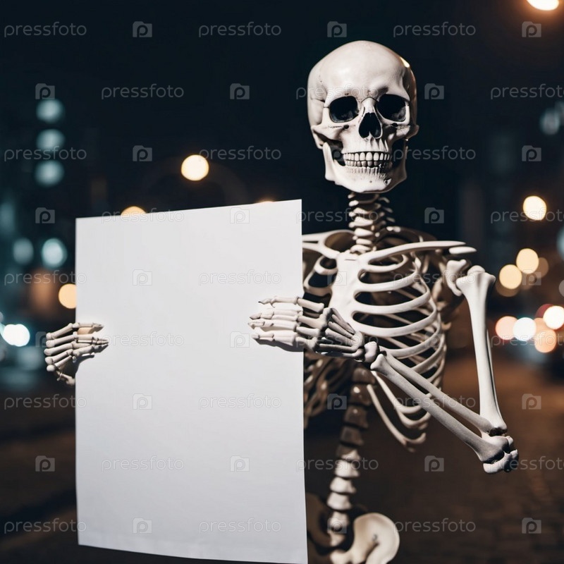 Фигура скелета стоит, держа белый плакат. Костящиеся руки скелета предлагают достаточно места для любого сообщения или дизайна. Скелет что-то предлагает. Тема Хэллоуина. генерируемый