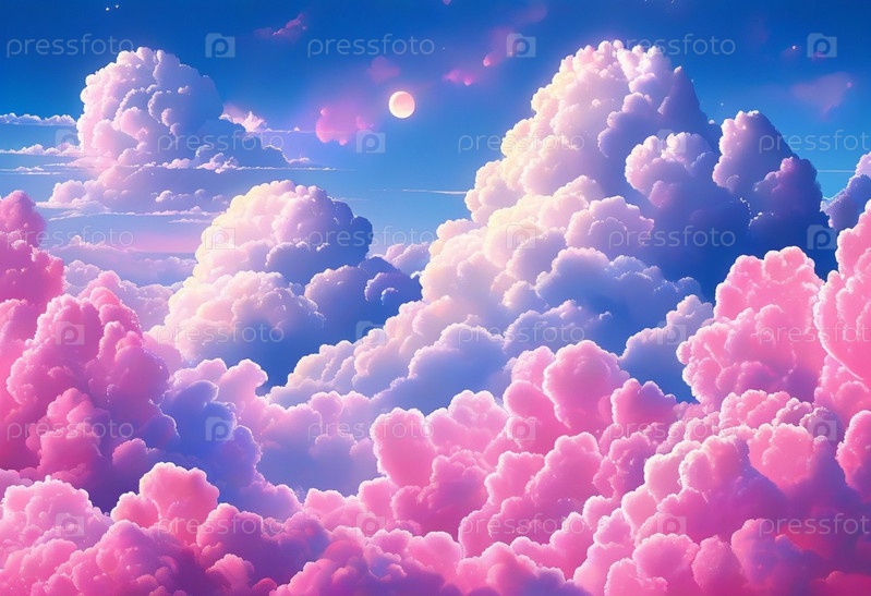 Красивые розовые пушистые облака в ярком закате неба. Визуальный дисплей. Драматические нереальные небеса с кучевыми и стратовыми облаками в атмосфере. Неизвестная планета с розовыми облаками Луна, планеты и звезды. Искусство