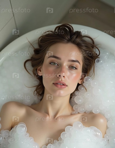 Молодая женщина с плавными волосами отдыхает в роскошной ванне, наполненной пушистой пеной, создавая спокойную атмосферу в хорошо освещенной ванной комнате во время спокойного дня