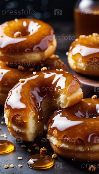 Пачка медовых глазурованных пончиков с глянцевым карамельным покрытием, украшенных хрустящими начинками, приглашая вас побаловать себя сладким угощением. Эти пончики идеально подходят для любого любителя десертов. Генерирующий ИИ