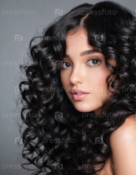 Изображение имеет крупный план человека с потрясающими, блестящими черными локонами, которые элегантно каскадируют вокруг их лица, подчеркивая природную красоту и очарование. Генеративный ИИ