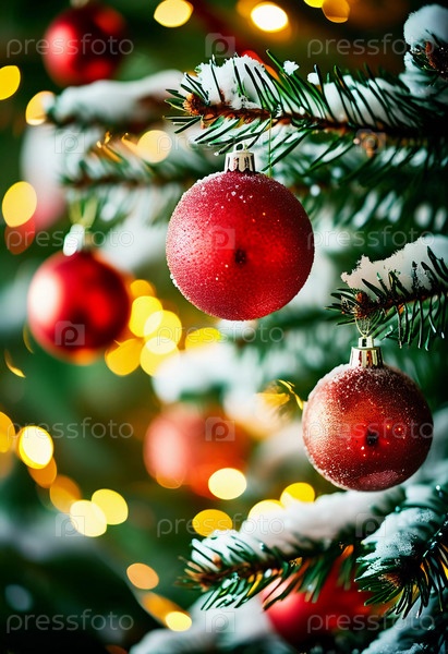 Красочные рождественские украшения украшают ветви елки, яркие шары в оттенках красного и розового, олицетворяющие праздничное настроение зимой. С Новым годом искусство боке фон. Генеративный ИИ