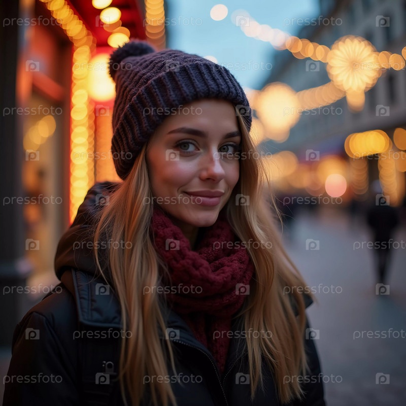 Потрясающая женщина мягко улыбается, когда вокруг нее падают снежинки в восхитительной городской обстановке, захватывая магию рождественского сезона. Красивая блондинка с длинными волосами. Генеративный ИИ