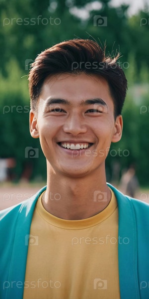 Молодой человек 25 лет с яркой улыбкой стоит на улице, в окружении оживленной деятельности. Житель Казахстана, милый мужчина 25 лет. Взрослый человек, уверенный в своих силах. генерируемый