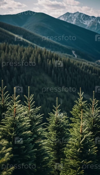 Величественные горы возвышаются над безмятежным еловым лесом под драматическим небом, демонстрируя красоту природы в сумерках. Высокие горы с холмами и угрюмым небом, освещающим мирную пустыню. ИИ