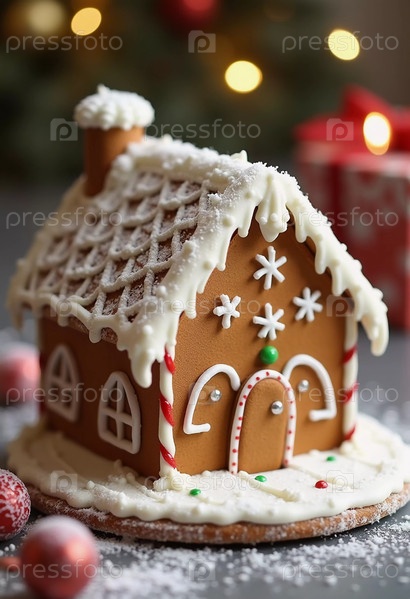 Очаровательный пряничный дом со снежной крышей сидит на тарелке, окруженный праздничными украшениями, захватывая дух праздника. Белый сладкий сливочный крем. Новый год, рождественское украшение. Генерирующий ИИ