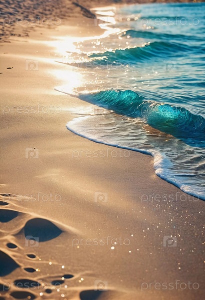 Волны мягко примыкают к песчаному берегу, создавая красивые узоры, сверкающие на солнечном свете. Этот спокойный летний пляж предлагает отдых и наслаждение красотой природы. Генеративный ИИ