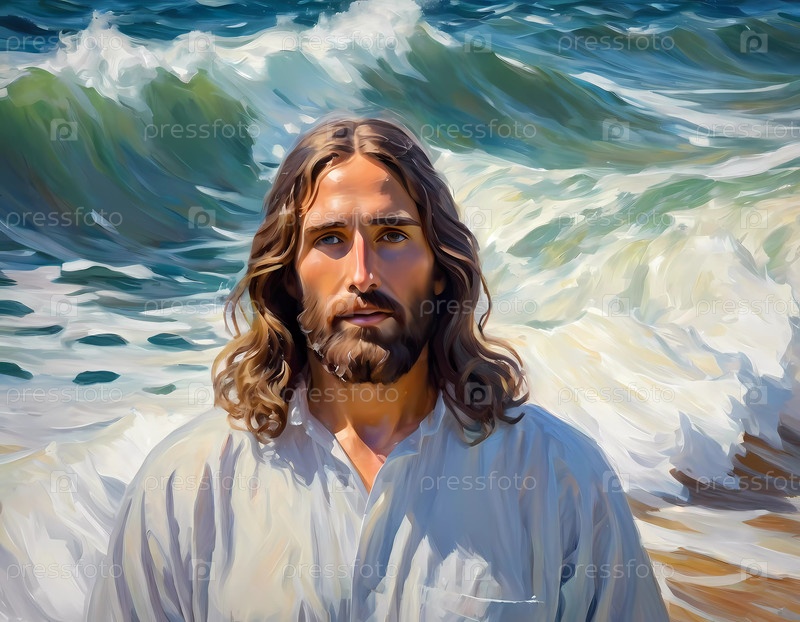 Христос на волнах. Портрет мужчины, одетого как Иисус. Белый халат. Длинные каштановые волосы и борода. Человеку, по-видимому, около 30 лет, и у него серьезное выражение лица. Христианская религия и вера. ИИ