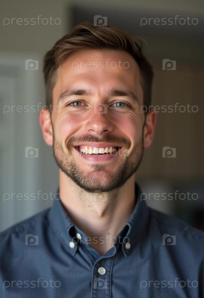 Веселый молодой симпатичный мужчина 30 лет, житель США, с короткими волосами и ухоженной бородой тепло улыбается во время ношения повседневной одежды. Мягкое освещение улучшает дружественную атмосферу. Генерирующий ИИ