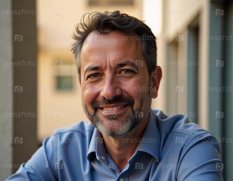 Веселый житель Израиля тепло улыбается, прислонившись к зданию. Солнце бросает мягкое свечение, подчеркивая спокойствие городской среды вокруг него