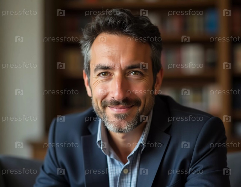 Житель Израиля с теплой улыбкой удобно сидит в библиотеке. Окруженный книгами, он воплощает расслабленное, но профессиональное поведение, захватывая суть спокойного созерцания ИИ