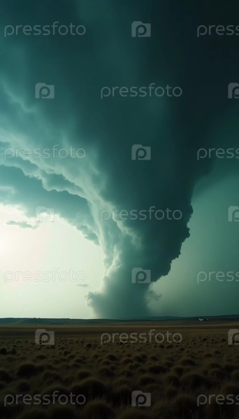 Мощный торнадо простирается вниз от закрученного неба, его темная воронка спускается в плоскую местность внизу, создавая впечатляющее, но пугающее проявление мощного искусственного интеллекта природы