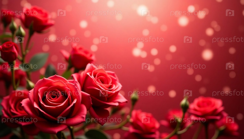 Пышные красные розы цветут страстно, бархатистые лепестки ловят нежный проблеск боке. Очаровательная аранжировка, завораживающая атмосферой, вызывает восхищение. Чистое пространство приглашает сердечные сообщения