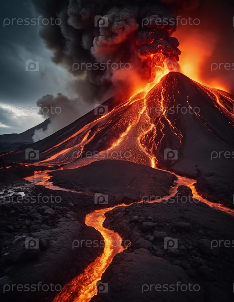 Величественное извержение вулкана освещает пейзаж потоками лавы, в то время как пепел и дым проникают в сумеречное небо, создавая потрясающее природное зрелище