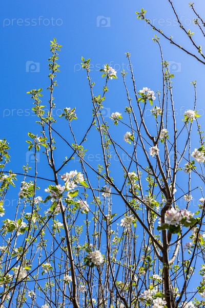 Ветви деревьев с вишневым цветением и голубым небом