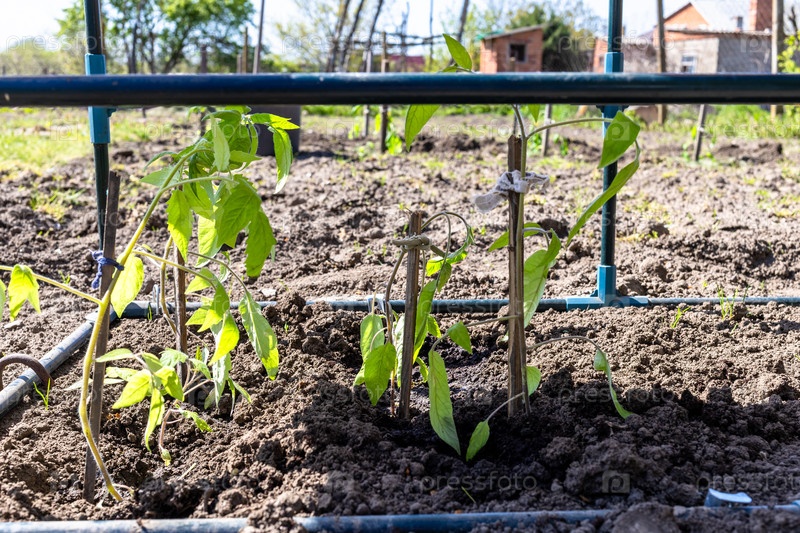 Помидорные саженцы в открытой кормовой кровати в саду