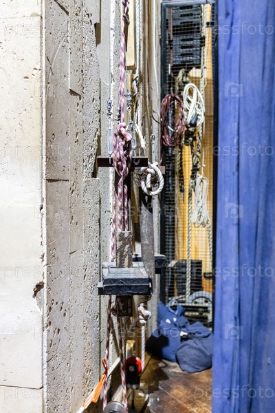 Веревки и механизмы для поднятия занавеса за театральной сценой