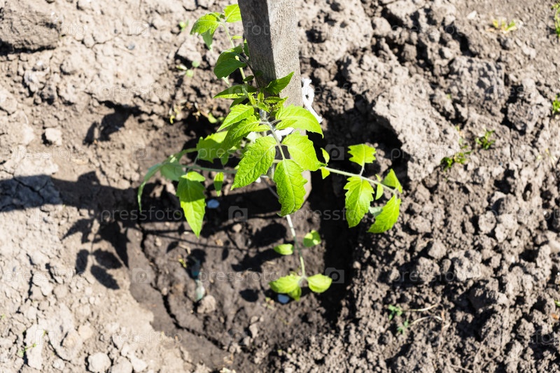 Верхний вид саженца помидоров с деревянным опорным пунктом