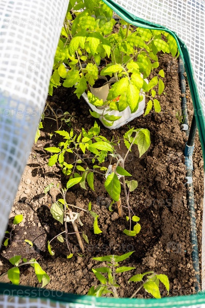 Вид на рассаду томатов в открытой теплице