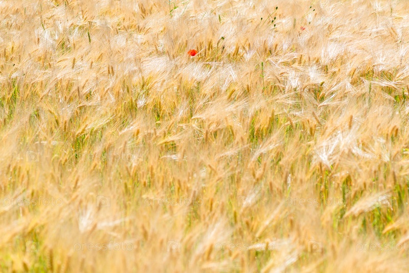 Редкие маковые цветы в желтых ушах пшеницы в поле