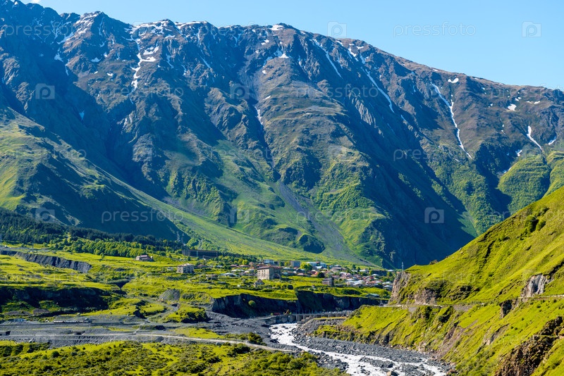 Деревня Гергети на фоне высоких Кавказских гор в Грузии