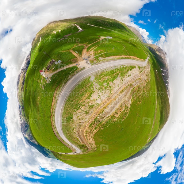 Панорама сферического живописного горного ландшафта и Военно-Грузинская дорога, Грузия