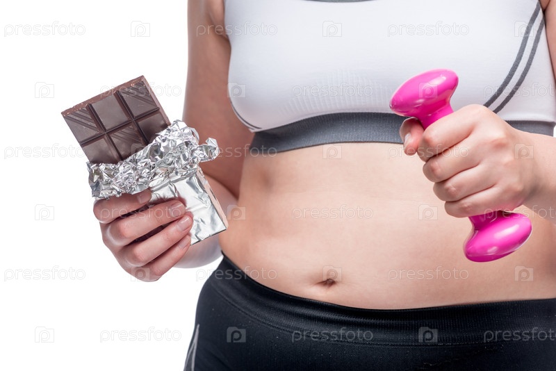 Женщина, держащая в руках гантели и шоколад, крупный план живота