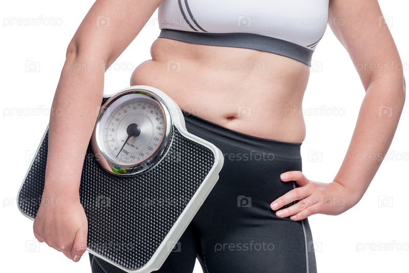 Концептуальная фотография стремления к идеальной фигуре, женщина с весами, крупным планом живота