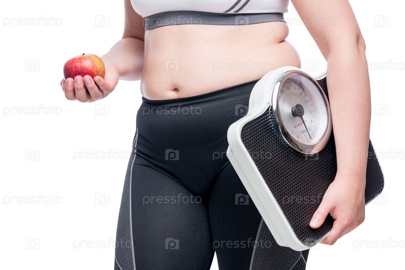Женщина с чешуей и яблоком делает выбор в пользу спортивного и здорового питания