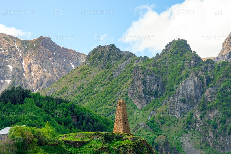 Высокая традиционная башня Грузии на фоне высоких гор Кавказа