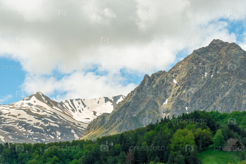 Высокие горы с остатками снега в Грузии летом, Кавказ