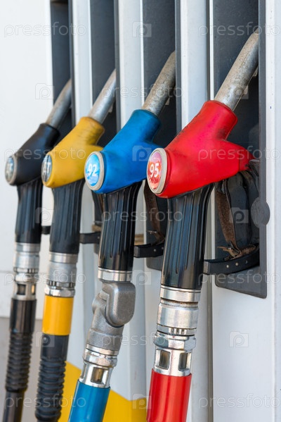 Вертикальная фотография топливных пистолетов на заправке закрывается