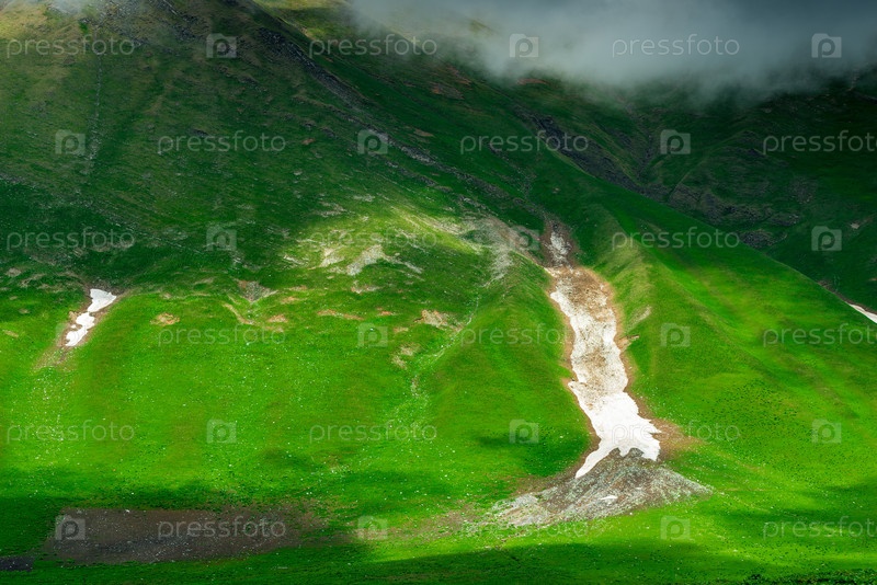 Зеленый склон горы с остатками снега после зимы, Кавказ в июне