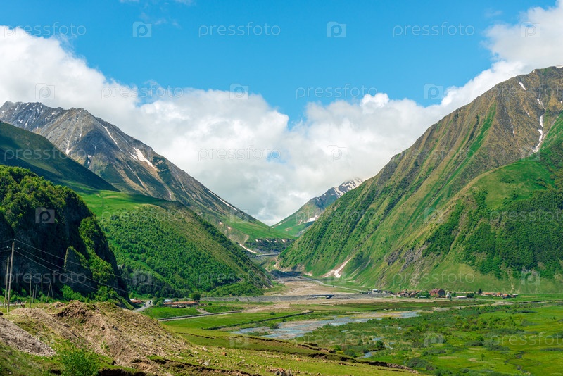 Живописное ущелье и вид на высокие красивые горы Кавказа, путешествие по Грузии