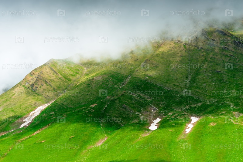 Горный склон покрыт травой с остатками снега после зимы, Кавказ в июне