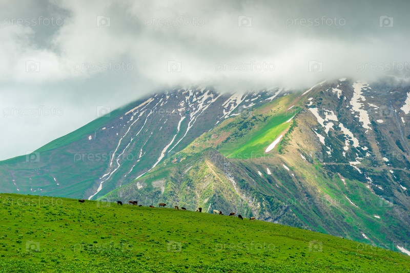 Коровы на зеленом лугу пасутся у подножия высоких гор Кавказа, Грузия