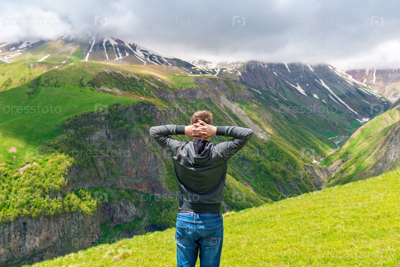 Мужчина восхищается красивыми пейзажами в горах, видом со спины