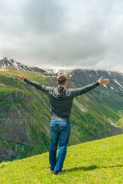 Человек, любящий красивые горные вершины, вид со спины с вытянутыми руками