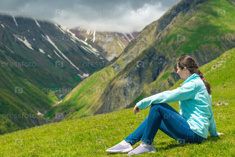Женщина сидит на траве и любуется красивым горным пейзажем на Кавказе