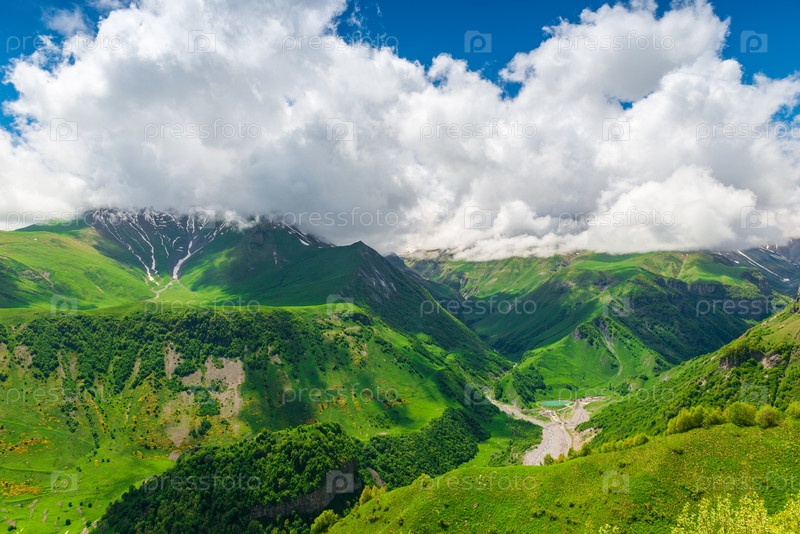 Красивые кучевые облака над ущельем и высокие горы Кавказа в Грузии