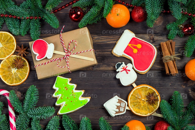 Вкусное печенье и высушенные оранжевые ломтики на столе рядом с новогодним подарком