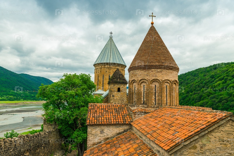 Достопримечательность Грузии - крепость Ананури с видом на долину реки в пасмурный день