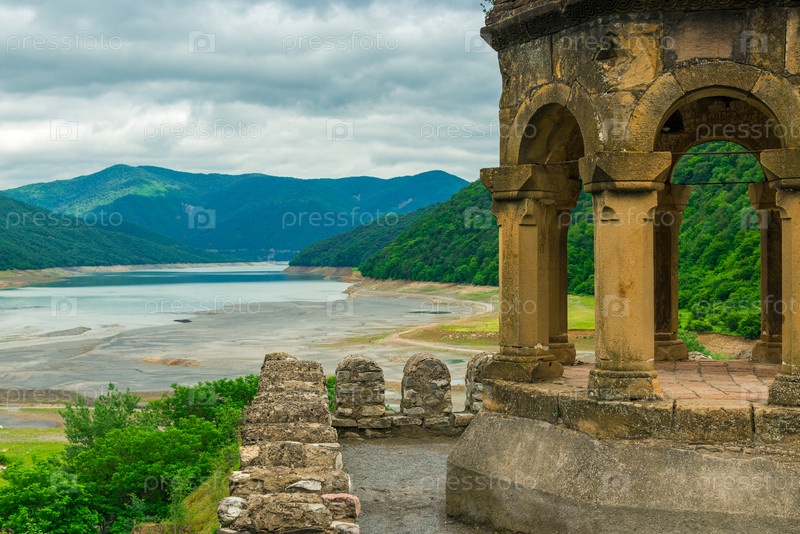 Колокольня крепости Ананури в Грузии на Военной дороге Грузии с видом на озеро