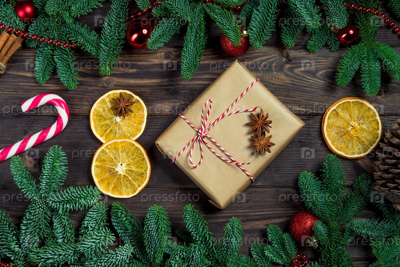 Рождественские подарки, сушеный ароматный апельсин и пушистая елка концепт-объекты Рождественская поздравительная открытка вид сверху