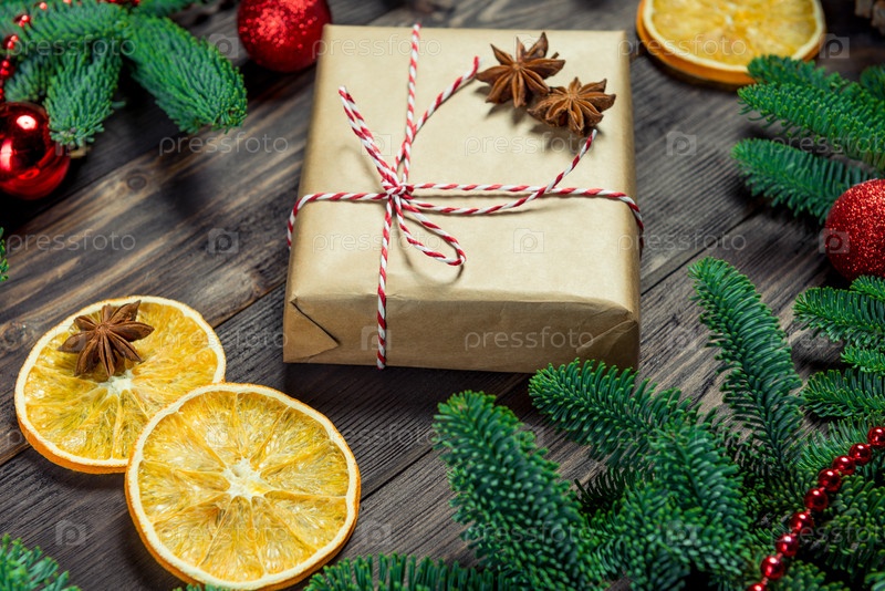 Подарок в ретро-бумаге, анисе и сушеном апельсине возле ветвей новогодней елки