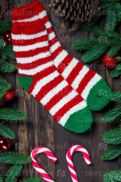 Пару теплых зимних полосатых носков на Рождество в подарок на деревянном столе крупным планом