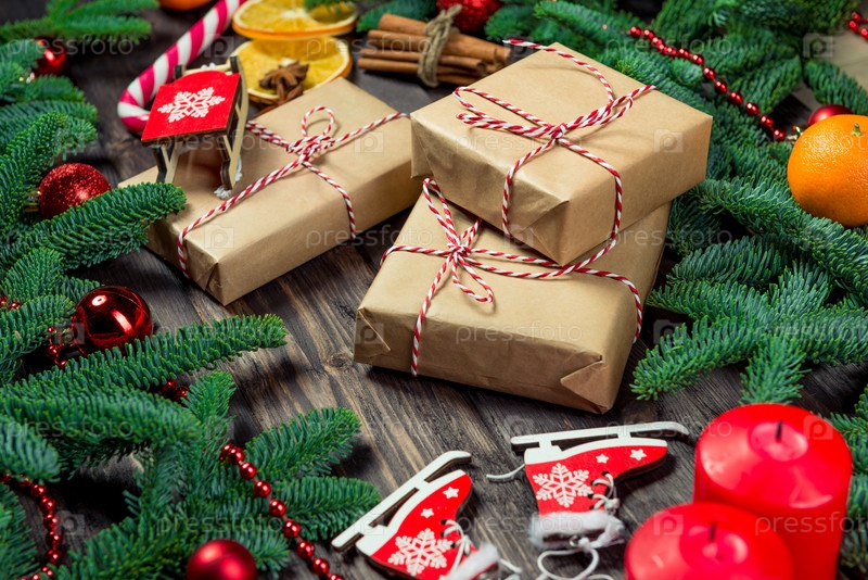 Объект Рождества - Три подарка в ретро-обертке, корица и зеленая плотная еловая ветвь